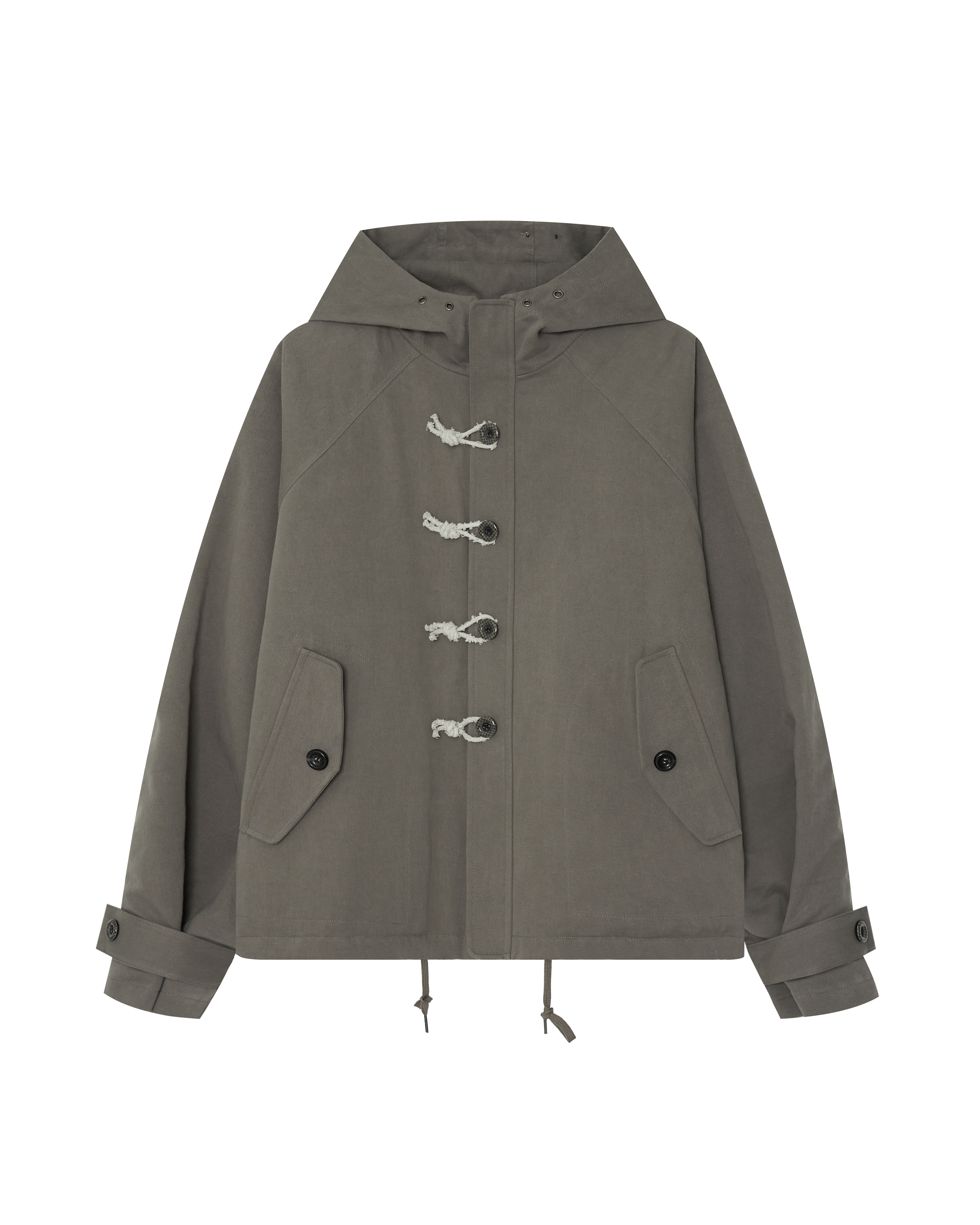 하이넥 지퍼 및 단추 여밈과 후드와 소매 버튼 포인트